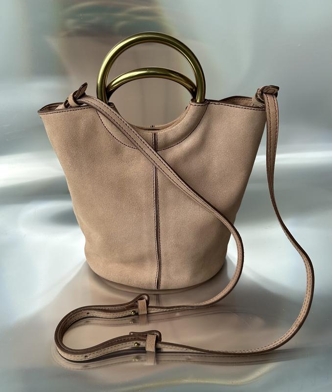 Сумка американского бренда J.CREW из натуральной замши с длинным ремешком. высота с ручками 27 см Ширина 23 см Ширина сбоку 9 см внутри одно общее отделение, карман на молнии и два обычных кармана Фурнитура темное золото
