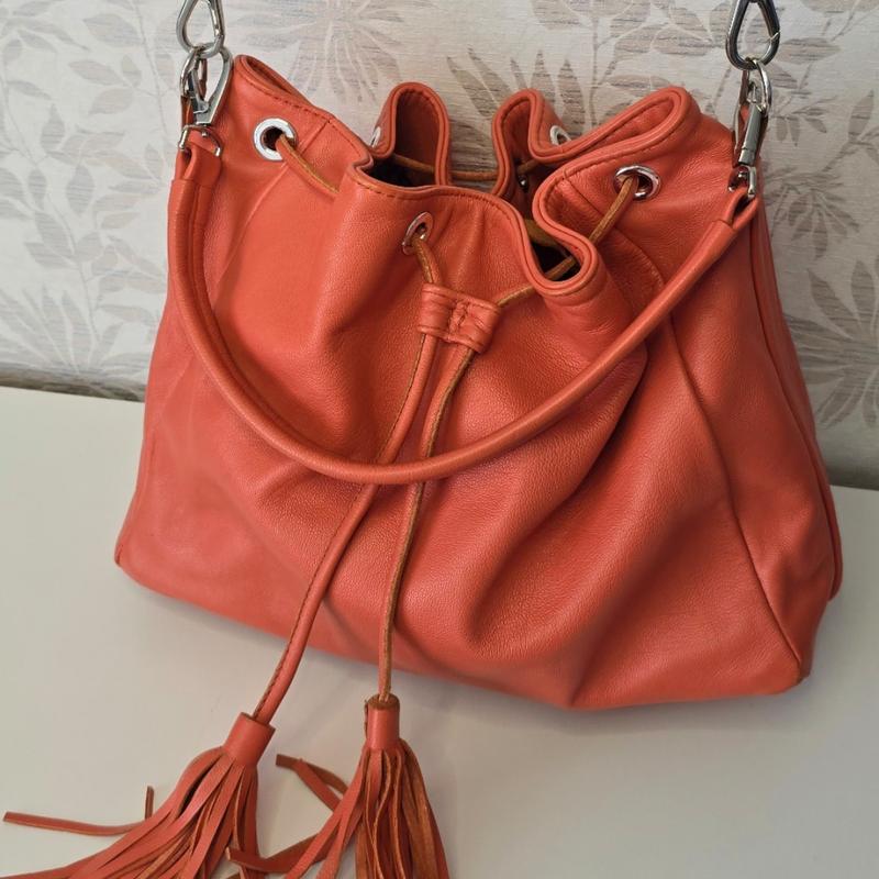 Сумка - нат кожа, делалась под заказ украинскими мастерами. Состояние хорошее- есть нюансы( уголки, но в носу почти не заметны, можно убрать у мастера). Кожа очень мягкая на ощупь. Цвет не такой яркий, он более теплый, приглушенный Размеры не затянутся шнурами 36× 24×12 очень красивая яркая подкладка