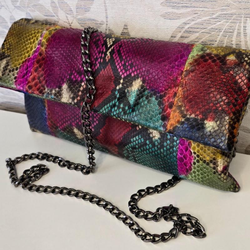 новый! Яркий и стильный клатч из кожи питона, привезенный с Бали. Одно деление, без карманов. На цепочке. Размер 27×23