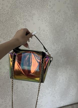 Прозрачная сумочка, которая станет заточенной в твоем гардеробе🥰 Имеет золотую цепочку и черную ручку Содержимое и удобное в использовании Из-за своей цветности не видно, что у тебя в сумке😍