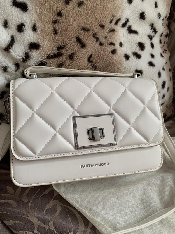 Классическая белая сумка. Стан идеален, но есть на задней внешней части есть едва заметные желтые пятнышки, прикрепленная фото, в носке они незаметны. Также спереди над застежкой есть едва заметная синяя пятнышка, фото тоже кстати. Есть два отделения, сумка на замочке и на внешней защелке. Также есть ремень, который регулируется и при необходимости снимается. Длина 22 см Высота 13 см Ширина по дну 7 см