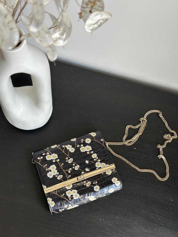 Кожаная сумка Massimo Dutti на цепочке в хорошем состоянии. Сумка изготовлена из натуральной кожи, стилизована под крокодила, цветочный принт. Единственный недостаток - немножко стерлась позолота на застежке, это видно на 4 фото.