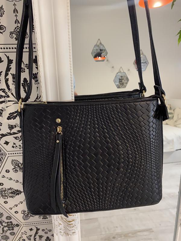 Сумка черная,в идеальном состоянии, без дефектов, внутрь один карман боковая на молнии, два маленьких боковых,одное отделение.Двые карманы извне, спереди и сзади.Ручка регулируется,сумка вместительная, застегивается на молнию