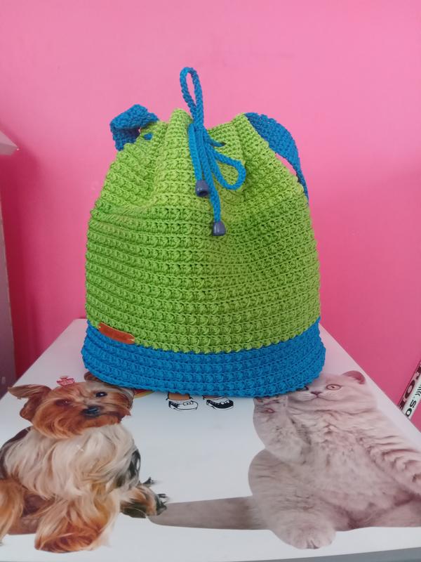 Новая сумка ,связана из полеэфирного шнура. ( ручная работа) длина 30 см. ширина 33 см.( полуобхват) длина ручки 45 см.