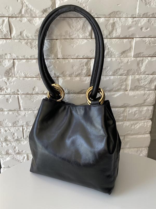 Стан идеален. 100% кожа снаружи и внутри. Цвет черный. Длина 24 см, высота 23 см, ширина 11 см, длина ручки 29 см, можно делать длиннее на 58 см.