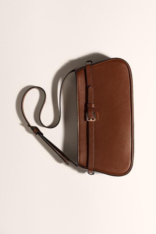 Цена 1210 Сумка через плечо трапециевидной формы с декоративным поясом в верхней части. Регулируемый ремень с металлической пряжкой и молнией в верхней части. Подложен. Ширина 6 см. Висота 13 см. Довжина 25 см. Артикул: 1236200002