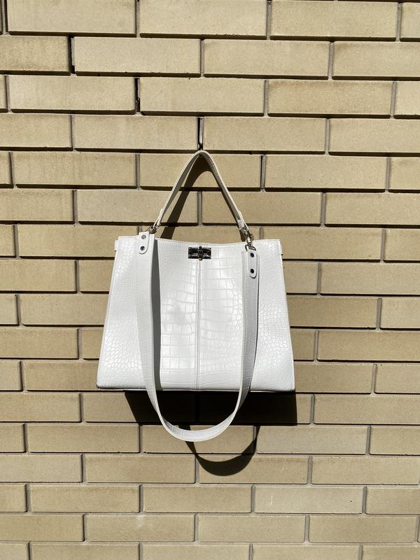 Белая деловая летняя сумка держит форму есть длинная ручка серебряная фурнитура