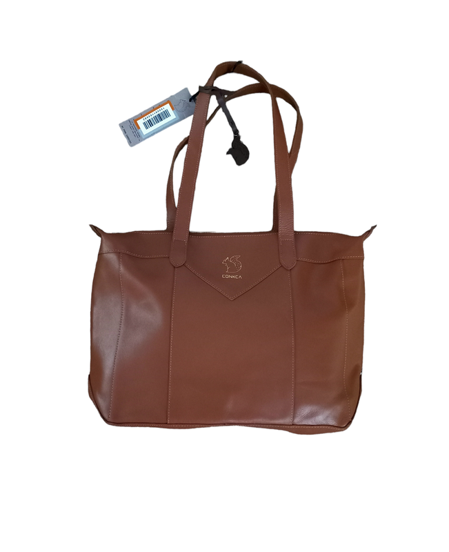 Сумка из 100% кожи, изготовлена вручную, английский бренд. Брендированная, одно отделение, брелок - белочка, застегивается на молнию, без подкладки. Размер: высота - 28 см, ширина - 41,5 см, ширина дна - 12 см, длина ручек - 57 см. Есть нюанс - маленькая царапина (последняя фото).