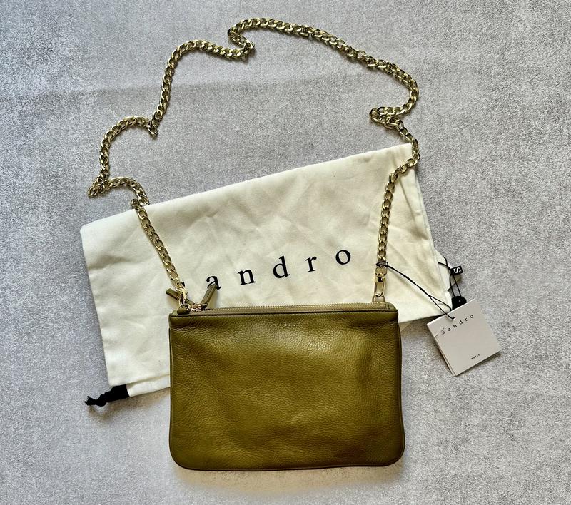 Оригинал! Цена без торга! Кожаная сумочка, сумка клатч люксового бренда Sandro Paris с биркой Вместительная сумочка клатч на змейке на два отделения, внутри есть кармашек. Длина ручки регулируется Вся фурнитура брендированная В комплекте оригинальный пыльник Цвет: оливка, хаки Замеры: ширина - 24см высота - 15,5см