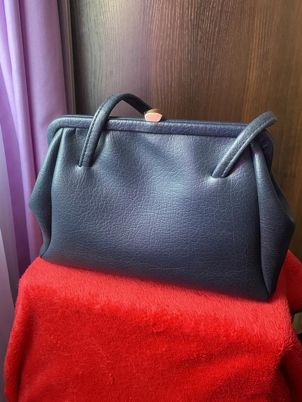 Сумка темно-синего цвета из натуральной кожи. Подкладка в пятнах (не пробовала вывести), внешне состояние хорошее. Интересная застежка, очень удобная, размеры на фото