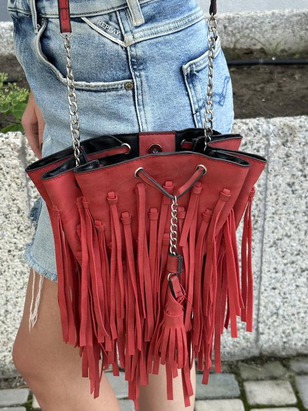 Маленька червона сумочка з бахромою. Виготовлена з екошкіри, має довгий ланцюжок