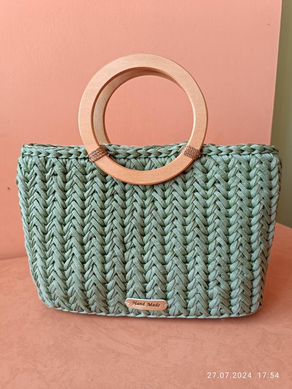 Сумочка связана из полипропиленового шнура, ручки деревянные. Ширина сумочки по дні 30-34 см.