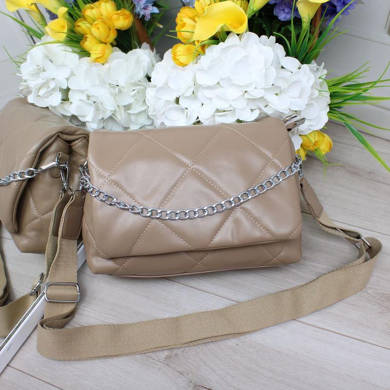 Стильная сумочка 🔥🔥🔥 по акций цене Код Д338 Цена 630 грн Параметры: высота 18 см, ширина по дну 27 см, дно 9,5 см. Длина ремня регулируется до 150 см. Цепочка съемная 38 см. Материал: эко кожа, качество🔥 Особенности: сумка закрывается на каплан с магнитом, два отделения на молнии. Дополнительно карман на молнии. Подкладка -плотная ткань.
