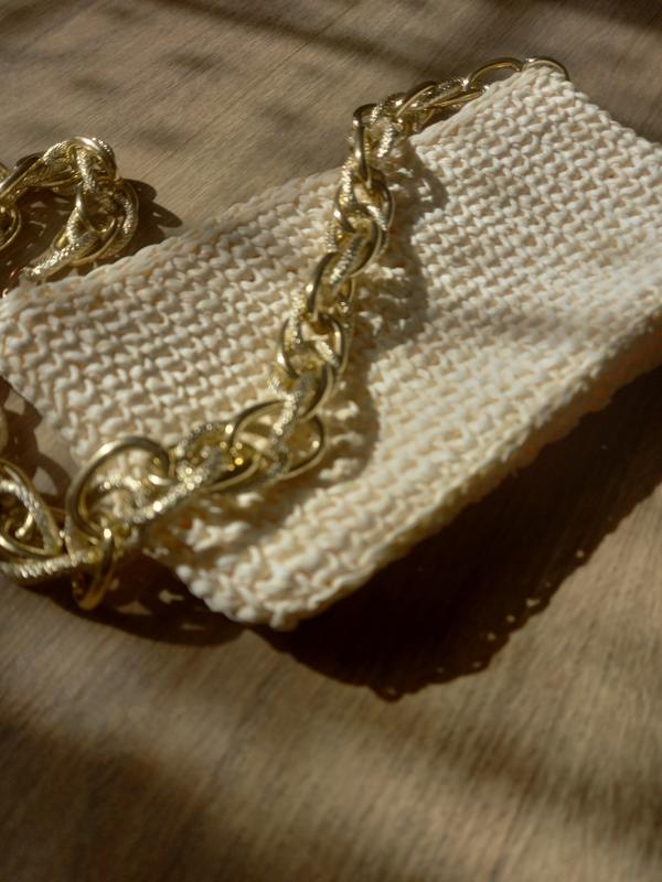 Повністю ручна робота.Клатч із органічної пряжі.Рафія.Колір айворі.Розмір 20х12см.Висота ланцюжка 30см.Ланцюжок з'ємний,на карабінах.