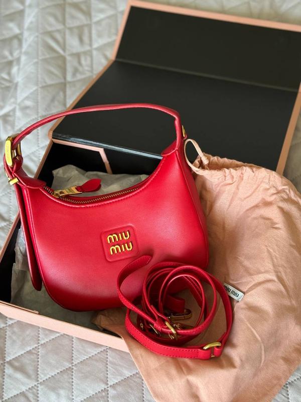 MIU MIU ❕ВНИМАНИЕ, пришли без коробок, поэтому снижена цена❕ 💘 Размер : 21х23х7 см 💘 Материал : натуральная кожа 💘Один отдел, маленький карман 💘Металлическое лого внутри 💘Длинный ремешок 95 см максимальная длина (регулируется) 🌸 В комплекте:обычная белая коробка, упаковочная бумага, следик фирменный