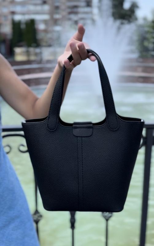Кожаная сумочка Размер:ширина вверху 27 см, ширина внизу 18 см, высота 19 см, толщина дна 12 см. Материал: натуральная кожа. Качественная фурнитура. Плотная ткань внутри. Цвет: бежевый, черный. В комплекте есть два ремешка: 1,5х125 см и 2,5х71 см. Хустинка для прикраси сумочки йде в подарунок.