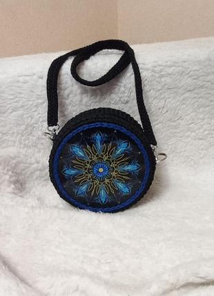 В'язана з поліефірного шнура сумочка. Бічні частини — пластик за типом оргскло. Малюнок можна замовити будь-який. Колір шнура теж. Ця сумочка в наявності та має 2 малюнки, представлені на фото. Діаметр денишкс 18 см.