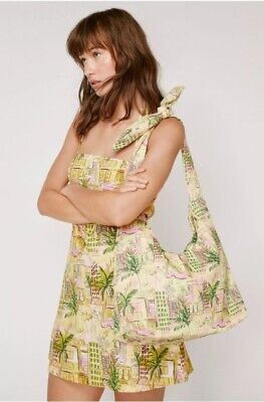 Эта сумка, безусловно, дополнит ваш летний лук своим интересным принтом и сочным желтым цветом. Необычный элемент - ручка на завязках. Ширина сумки - 40, длина - 25, длина ручки - 70, но ее можно регулировать. Сумка застегивается на молнию, в середине есть карман также на молнии.
