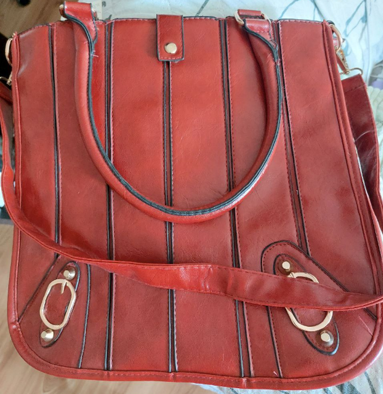 Многофункциональная большая сумка интересного дизайна из искусственной кожи. Сложный цвет, что в зависимости от освещения меняется от кирпично-коричневого до темно-маранчового. Фурнитура золотая. Застегивается на молнию в тон и клапан на кнопке-магните. Дополнительный объем обеспечивается боковой молнией. Короткие и длинные ручки. Внутри стандартный набор карманов + карман для документов на молнии. Размер 34 х 33 х глубина от 3 см до 12 см.
