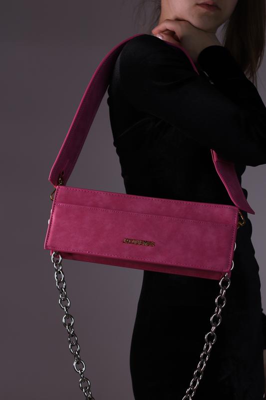 Le Ciuciu fuxia Арт: 0121 Размер: 30х11х6 Материал: эко кожа Цвет фурнитуры: золото, серебро Женская сумка Жакмюс выполнена из качественной эко кожи. Прикрашена металевим, золотим логотипом Jacquemus. На лицевой стороне есть открытый кармашек. В сумке одно основное отделение, которое застегивается на молнию, имеет внутренний открытый кармашек. Подкладка текстильная. В комплекте два сменных ремешка, один с маленьким кармашком для карт из эко кожи, вторая металлическая цепочка с двойным карабином по центру. Упаковка: брендовая коробка, наполнитель, бумага.