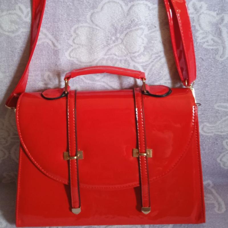 Красивая яркая лаковая сумочка.ремешок регулируется..рич в отличном состоянии.фурнитура золотистого цвета.высота 21 см.ширина внизу-31 см.ширина сверху 28 см