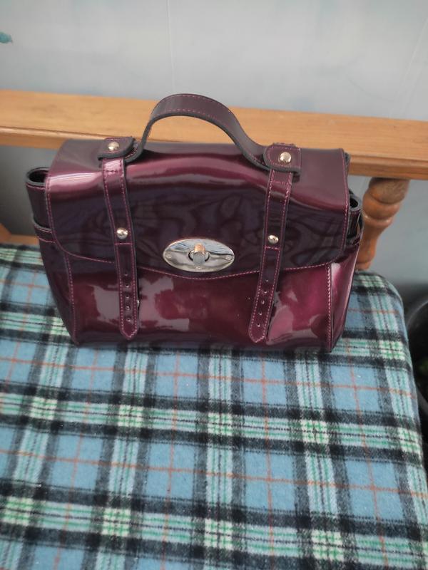 Красивая бордовая сумка из настоящей лакированной кожи.Есть длинная ручка, которую при необходимости можно отстегнуть.Меет одно отделение с двумя карманами.Фирмовая.Коряжалась за рубежом.