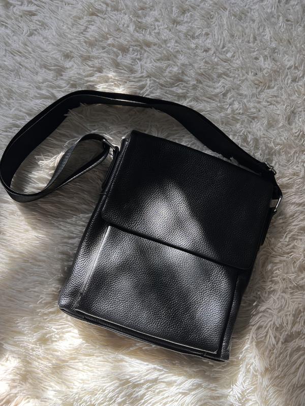 Мужская сумка выполнена в классическом стиле из натуральной кожи. Мессенджер имеет основное вместительное отделение и несколько функциональных карманов. Плотная текстильная подтяжка сохраняет форму и первоначальный внешний вид, не деформируясь от тяжести сумки и обеспечивая максимальный комфорт во время носки. Клапан с функциональными застежками-магнитами придает аксессуару лаконичность и подчеркивает минимализм модели. Особенности мессенджера: бескаркасная модельтельня кожа глянцевая зернистая поверхность, цвет черный, размеры (см): 24 × 28