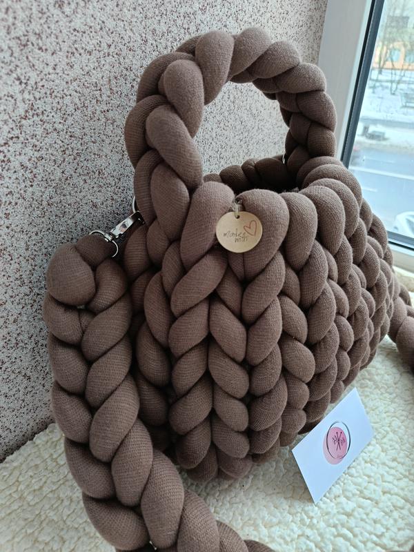 Сумка зефир в шоколадном цвете 🤎 + удлиненная ручная. Размер - бег макси. Цена - 1300 грн. Выполнена из пряжи Yarnart. Состав - сверху хлопковая оболочка 37%, внутри наполнитель полиамид 63%. На заказ может быть выполнена любого размера и цвета 😍 Для заказа обратитесь в дырэкт 💌