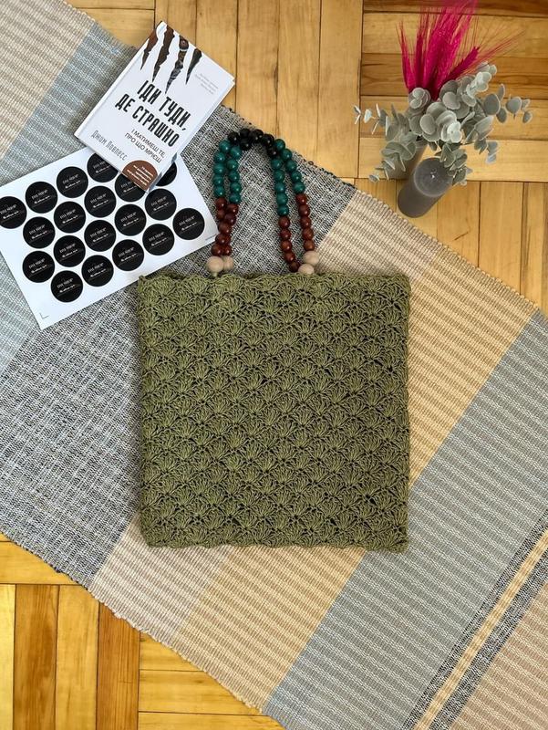 Плетена паперова сумка. Деталь из бисера на ручке. Обшитый интерьер. Застежка на магнитную застежку. 100% полиэстер.