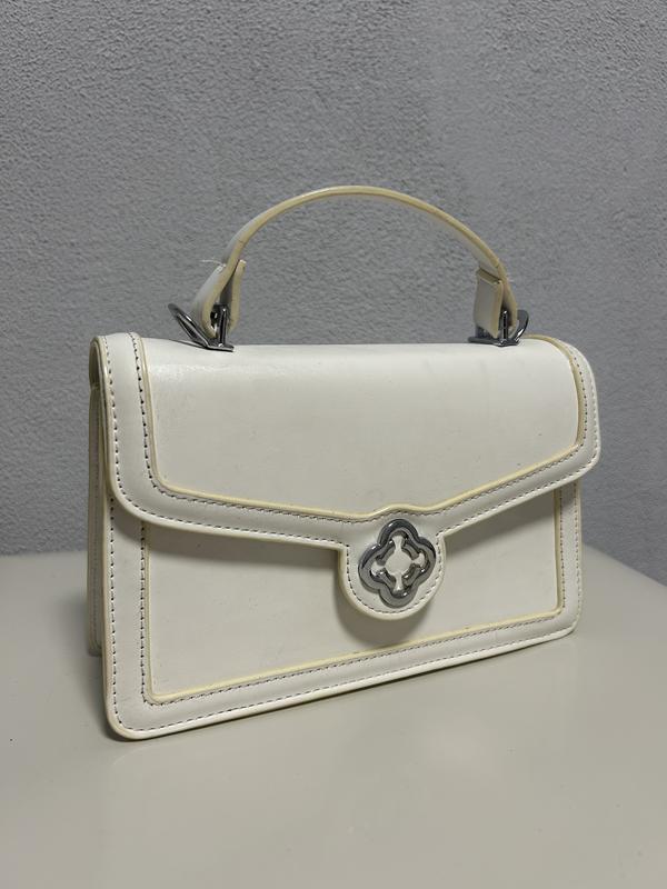 Сумка женская белого цвета. Небольшая 22см на 14см, ширина 6см. Закрывается на магнит, а также внутри на молнию, вся фурнитура не повреждена. Сумка на текстильном ремешке, длина регулируется, он отстегивается, также есть маленькая ручка. Сумка почти не ношена, в хорошем состоянии, без каких-либо повреждений. Только от времени пожелтели швы, но в жизни не видно, в случае чего можно покрасить.