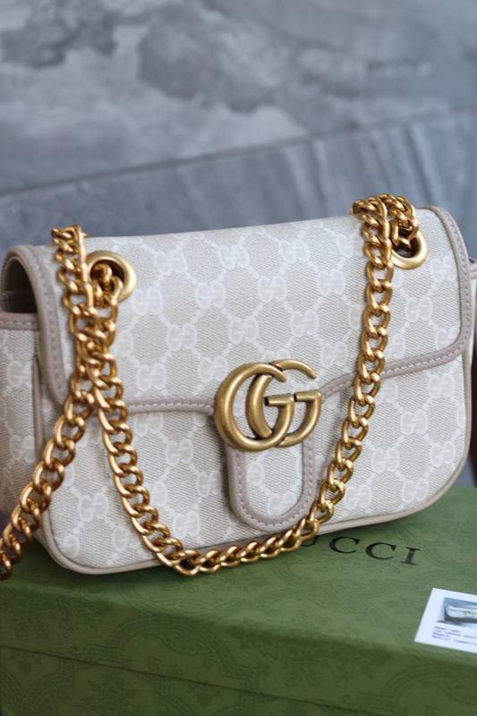Gucci beige Арт: 1307 Описание: Размер: 23х13х6 Материал: Эко кожа Сумка изготовлена из эко кожи с принтом логотипа, имеет одно основное отделение и боковой открывающийся карманчик. Подкладка текстильная бежевого цвета. Плечевой ремень - цепочка со вставкой из эко кожи, которую можно носить извлеченным на всю длину или составленным в два раза. Фурнитура золотистого цвета. Упаковка: брендовая коробка, замыватель, наполнитель.