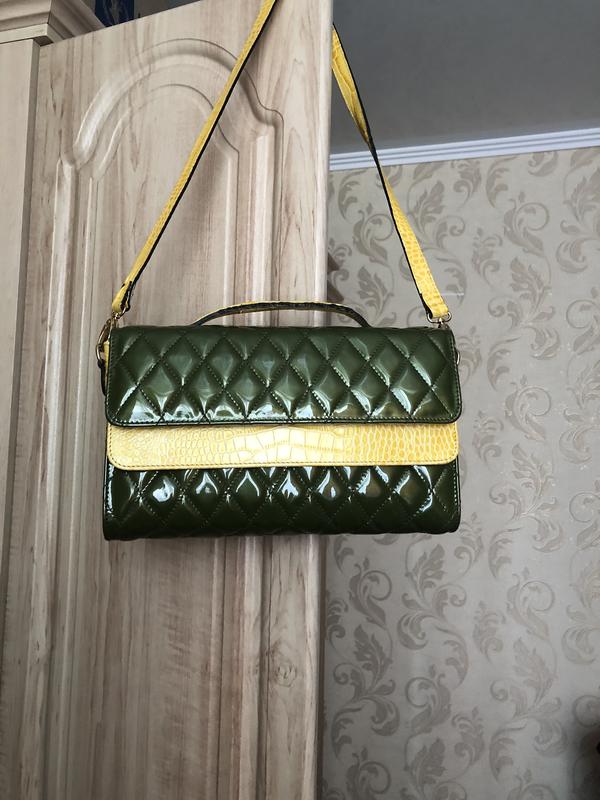 Лакована гарненька сумочка італійського бренду FELLINI. Вмістка, приваблива. Ширина сумочки- 30 см, висота- 18 см, ширина дна- 7 см. Одне відділення, 2 кармашки, Застібається на кнопки. Підкладка чиста, уся брендірована, тканина, як замша. В ідеалі.