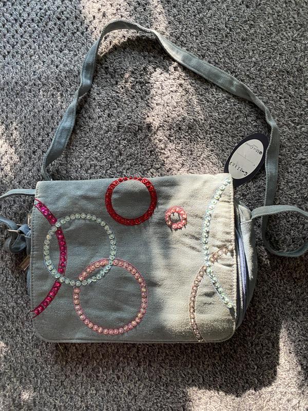 В хорошем состоянии, потеряла немного цвет, но это джинс потому выглядит красиво, с биркой Имеет много отделений, подойдет в школу идеально, ремень регулируется, украшена пайетками