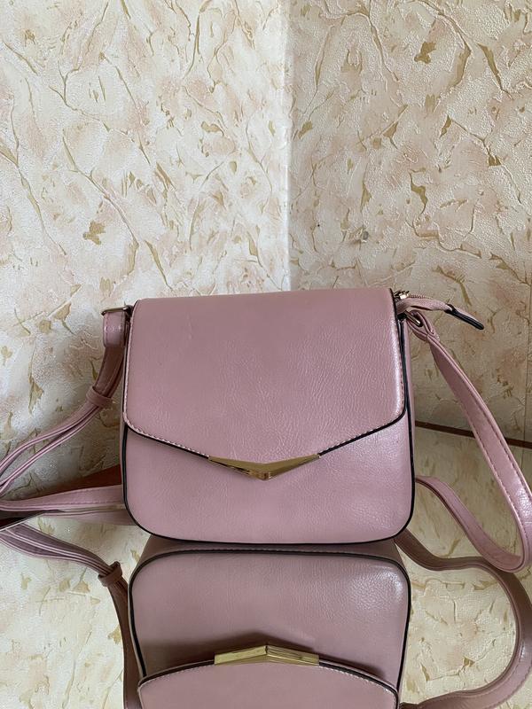 Розовая женская сумочка с регулируемым ремешком. Внутри имеет подкладку. Длина 21 см, высота 17 см, ширина 7. Имеет одно отделение, внутри есть карман на молнии и два маленьких без молнии. На задней стороне сумки также есть карман под молнией. Застегивается на молнию и магнит. Из дефектов небольшая мятина сверху и незаметное пятнышко снизу.