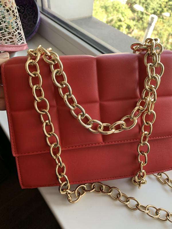 Ярко красная дутая сумочка.Одно отделение,один карман с молнией,один под телефон Р-р22.5*17*8 Ремень -цепочка—1м Ремень-цепочка,короткая ручка—33см