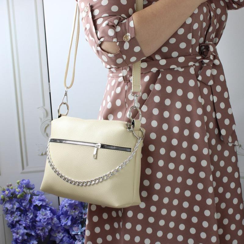 Новинка 💙 Код Д347 Размер: 25 см ширина по дну, 20 см высота, 9 см дно. Ремень регулируется до 140 см. Сумочка декорирована цепочкой, который можно использовать как ручку Материал: искусственная кожа Особенности: Два отдельных отдела. Внутри открытый карман и карман на молнии. На лицевой и обратной стороне карманы на молниях.