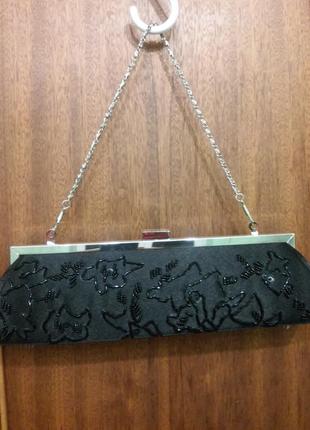 Вечерняя атласная сумочка полукруглой формы,вышита бисером,ручку- цепочку можна прятать в сумочку или отцепить ,размеры: 28 см длина,8 см высота, длина ручки 40см,состояние идеальное,без дефектов.