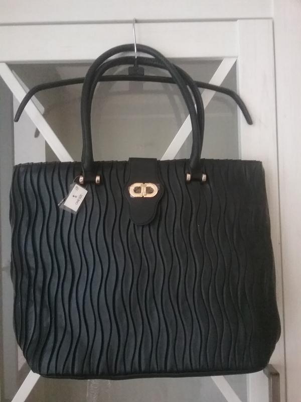 новая сумка из искуственной кожи,красивая,застегивается сверху на магнитную кнопку,внутри есть потайной карман на молнии,длина сумки 45см,высота 35см,ширина дна 14см