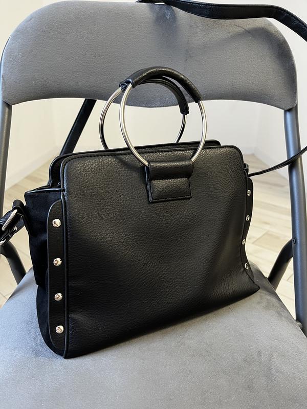 Класична сумка чорного кольору з боковими вставками з замші та металевими виробами по боках. Має металеві ручки , форми кола, та довгий ремінь . В середині складається з одного відділення та декількох маленьких.