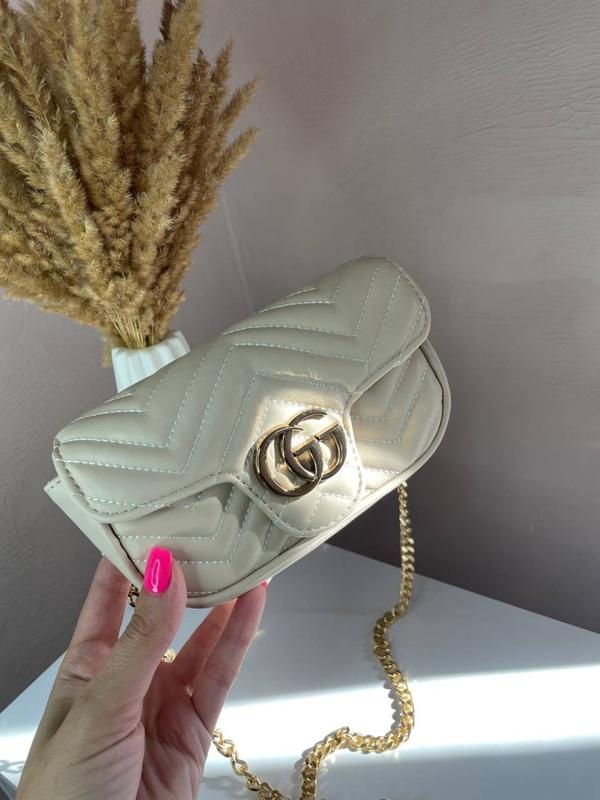 Сумка стеганая из гладкой эко-кожи европейского качества, бежевого цвета. Имеет одно отделение, внутри фирменный логотип,текстильная подкладка. Задняя стенка прострочена в форме сердца. Ремень-золотая цепочка длиной 120 см Размер: -Ширина 16см -Высота 10 см -Глибина 6 см