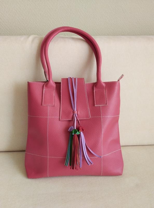 Сумка из искусственной кожи, розового цвета, две ручки, застежка - кнопка и молния, 3 отделения (одно на молнии), есть внутренние карманы (в т.ч. для мобильного), сумка на текстильной подкладке. Размеры : ширина 34 см × высота 32 см