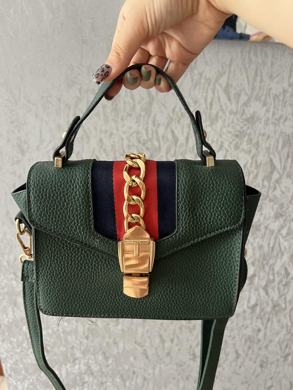 Маленькая сумочка в трендовом цвете -хаки с акцентным принтом.