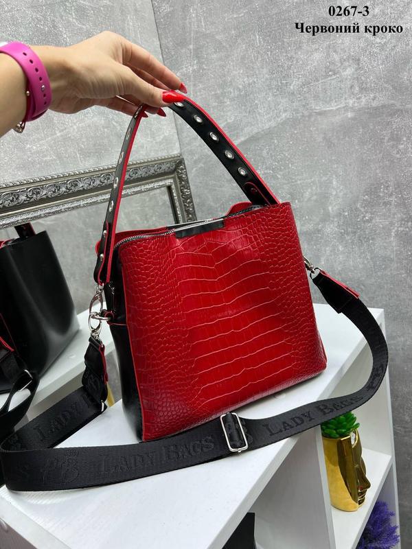 Эко кожа с крокодиловым принтом. ✔️27 см ширина. 23 см высота. 12 дно (товщина) . Три отделения. Среднее отделение на молнии. ✔️Внутри открытый карман и карман на молнии. Остальные два отделения на магните. В комплекте 2 съемных ремня. ✔️Высота короткого ремня 15 см. Максимальная длина плечевого ремня 150 см. Фурнитура серебро