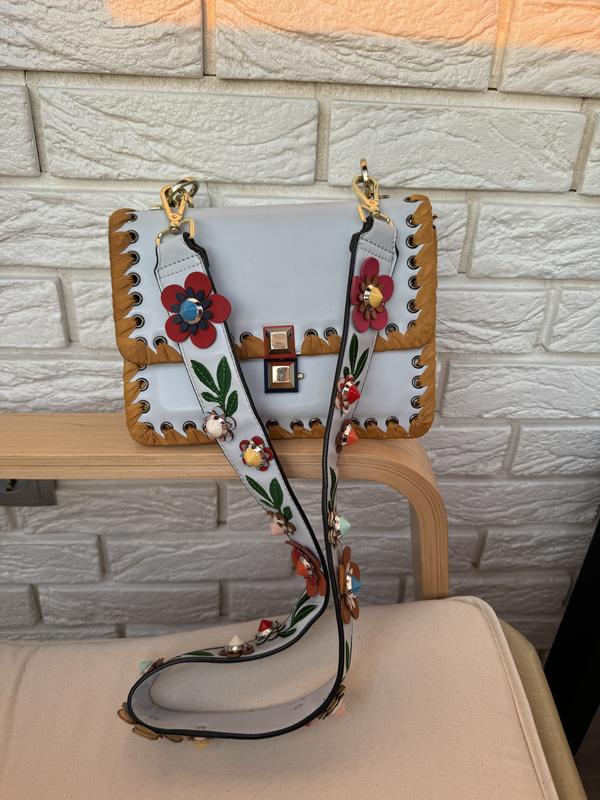 Сумка кожаная голубого цвета, состояние идеальна, с интересной ручкой в цветах, так же есть и маленькая ручка, очень стильная и красивая