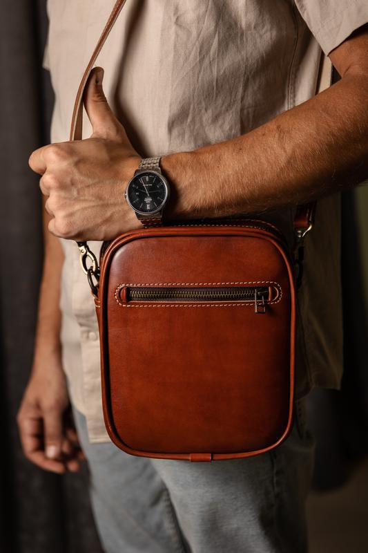 Сумка вертикальная через плечо на каждый день и не только. Стильное дополнение для повседневного использования. Имеет большое общее отделение, куда легко могут поместиться все необходимые вещи, один кармашек внутри для мелких аксессуаров и два кармана извне на молнии. • Размер: ширина - 19; высота - 23; толщина - 7 см • Пасок регулируется 120/100 см; ширина пояска 2 см • Основное отделение на молнии • Два внешних кармана на молнии • Внутренний кармашек • Кожаная подкладка • 100% натуральная кожа • Цвет изделия может отличаться от фото