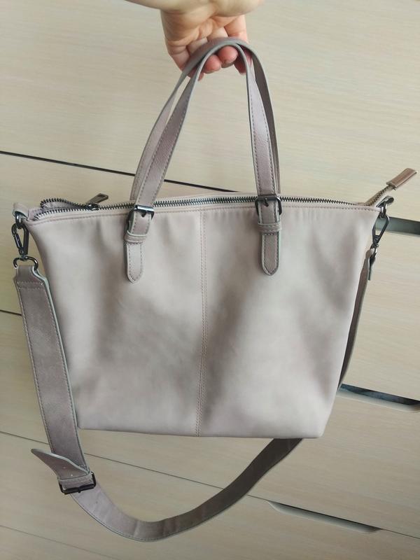 состояние новой, матовый кожзам грязно-розового цвета, одно отделение на замке-молнии, с тканевым подкладом и кармашком внутри, металл. фурнирура, съёмный широкий плечевой ремень с карабинами, высота 28см ширина ок.35см глубина по дну 12см