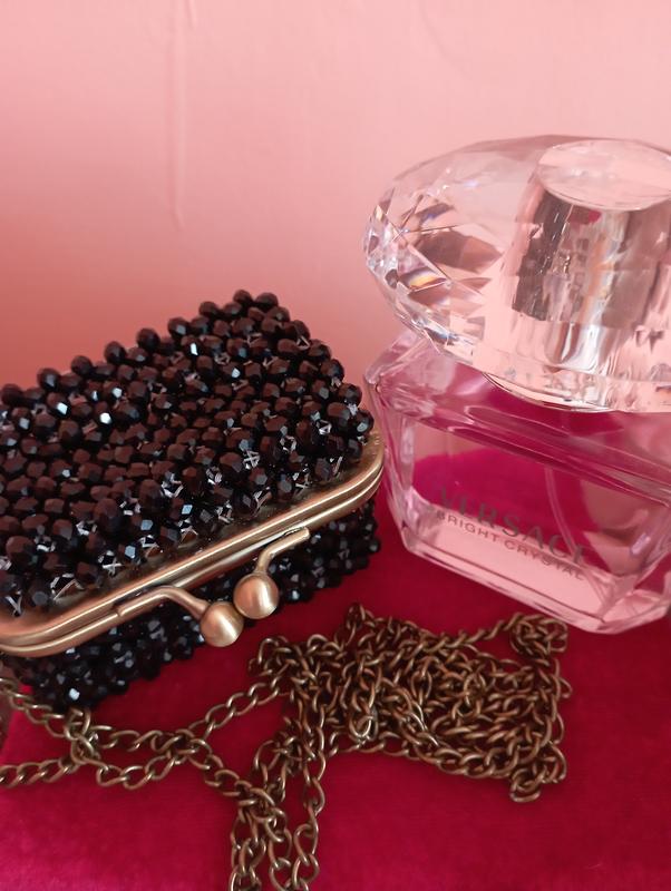 Черная мини сумочка с фемуаром выполнена из хрустальных бусин. Сверкает на солнце и в свете софистов. Подходит для ежедневного использования и для вечеринок.