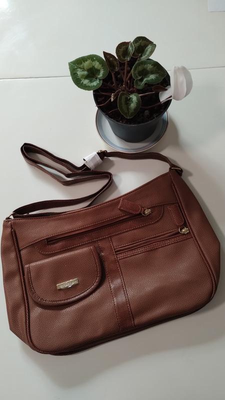 Сумка бренда Nathalie Andersen, экокожа, цвет: коричневый, внешне зернистый кожзаменитель, спереди 3 кармана, внутри гладкая подкладка, карман на молнии и два дополнительных кармана. Вся металлическая фурнитура с логотипом бренда, новая в идеальном состоянии, размер: в. 21 см., ш. 29 см., ш. сторону 6 см., ш. дна сумки 6 см. Длинный ремень, стильная, классная модель, ремешок регулируется.