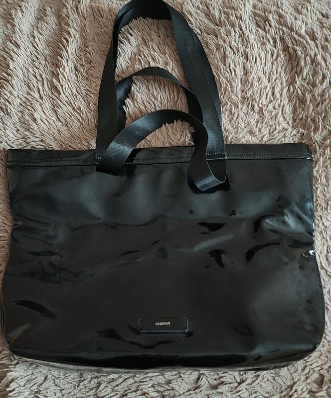 Сумка содержимая лакированная, ширина верх 47, по низу 44, ширина дна 12, высота 32, есть две ручки, короткие ручки длина 43, длинные ручки 62