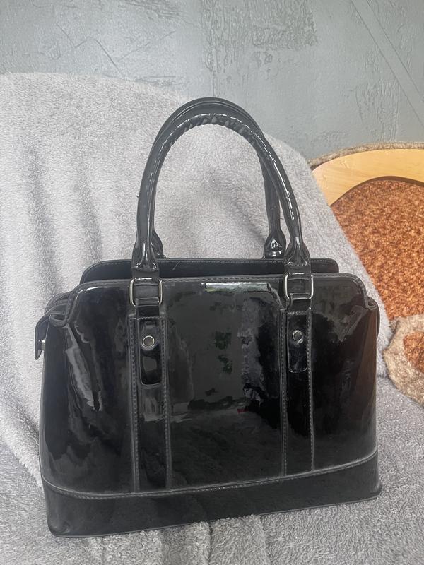 Черная вместительная сумка из лакированного качественного заменителя! Практически без дефектов, внутри только собачка из карманчика слетела. Дополнительные фото сделать.